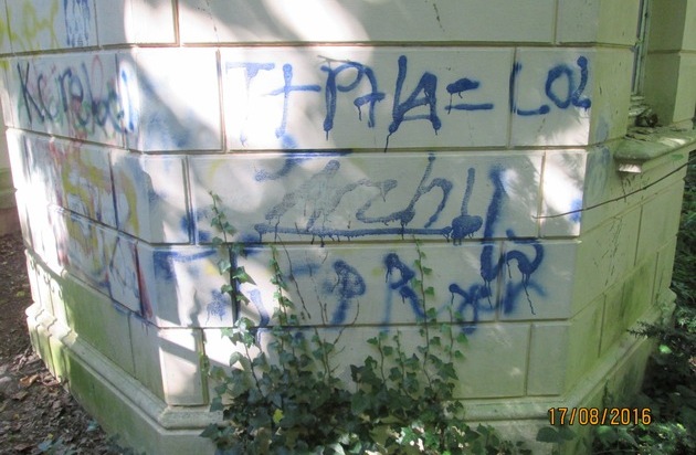 In der Zeit zwischen Samstag (13. August, 15:00 Uhr) und Mittwoch (17. August, 16:50 Uhr) befanden sich Unbekannte im "französischen Garten" des Schlossparks Türnich. Dort beschädigten sie vermutlich mit einer Axt die Baumrinde eines alten Baumes und eine Holzbank. Am Eingangstor, dem "Torwärterhäuschen", beschmierten sie die Gebäudemauer mit überwiegend blauer Farbe (Bild).