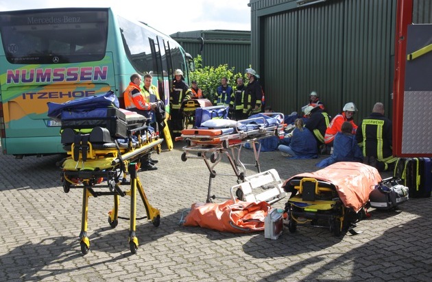 Unter realistischen Bedingungen probte die Rettungsdienst-Kooperation in Schleswig-Holstein (RKiSH) am vergangenen Samstag zusammen mit mehreren Feuerwehren und weiteren Hilfsorganisationen die Umsetzung ihres Konzeptes für Größere Notfallereignisse (GröNo) in der Albersdorfer Kaserne. Ausgangslage für die Großübung war der Zusammenstoß zwischen einem PKW und einem vollbesetzten Reisebus. Dabei gab es 45 zum Teil schwer Verletzte. Mehr als 250 Einsatzkräfte mit 49 Fahrzeugen verschiedener Organisationen waren kreisübergreifend an dem aufwendig vorbereiteten Szenario beteiligt.