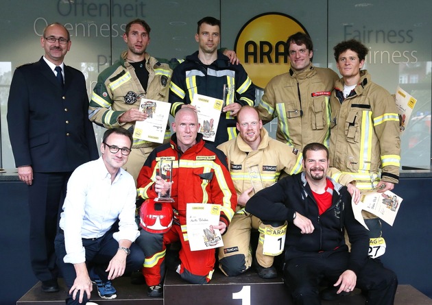 Beim heutigen 10. Skykun der Feuerwehrsportvereinigung Düsseldorf fließen nicht nur viele Liter Regenwasser am ARAG-Tower hinunter. Die 400 Teilnehmer verloren in ihrer Schutzkleidung sicherlich auch viele Liter Schweiß auf dem Weg bis in die 25. Etage. Nach sieben Durchgängen folgte noch der Finallauf: Jens Lüdeke und Martin Brieden vom Team "Hier könnte ihre Werbung stehen" entschieden den Endlauf mit einer Zeit von 4.14 Minuten gegen die Feuerwehrleute Krißmer und Woito von der Bundeswehr (4:47 Minuten) für sich. Der dritte Platz ging an die Titelverteidiger aus Ratingen Stefen Rick und Thomas Tremmel.