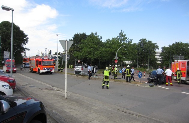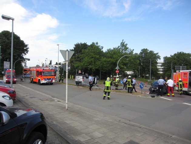 Um 11:50 Uhr heute Vormittag wurde die Leitstelle der Feuerwehr Mülheim an der Ruhr über einen Verkehrsunfall an der Xantener Str. nahe der Feuer- und Rettungswache Broich informiert. Dort hatte es an einer Kreuzung aus noch ungeklärter Ursache einen Zusammenstoß zwischen zwei Fahrzeugen gegeben. In einem Transporter befand sich ein Insasse und in einem PKW zwei Insassen, darunter ein Kind. Bei dem Zusammenstoß war der Transporter mit einer Verkehrsinsel und einem Verkehrsschild kollidiert und auf dem Dach liegen geblieben. Sofort nach Eingang des Notrufes alarmierte die Leitstelle den Rüstzug der Feuerwache Broich sowie den Führungsdienst. Bei der Erkundung vor Ort stellte sich schnell heraus, dass keine Person eingeklemmt war sowie beide Fahrer und vor allem das Kind glücklicherweise nur leicht verletzt waren. Alle drei Beteiligten wurden vom Rettungsdienst in umliegende Krankenhäuser transportiert. Währenddessen stellte die Feuerwehr nach Absicherung der Einsatzstelle den Brandschutz sicher, nahm auslaufende Betriebsstoffe auf und entfernte das abgeknickte Verkehrsschild. Die Drehleiter der Feuerwehr unterstützte die Polizei bei der anschließenden Unfalldokumentation. Die Xantener Straße war währende des Einsatzes in beiden Richtungen für ca. eine halbe Stunde gesperrt. (VHa)