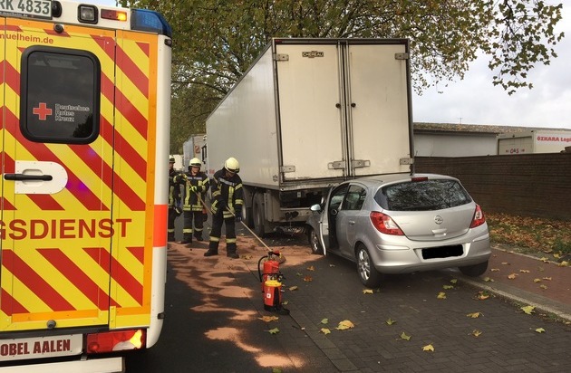 Heute Morgen um 11:00 Uhr wurde der Leitstelle der Berufsfeuerwehr Mülheim an der Ruhr ein Verkehrsunfall an der Ruhrorter Straße gemeldet. Ein Rüstzug der Berufsfeuerwehr und der Rettungsdienst wurden zur Einsatzstelle entsandt. Ein PKW ist unter einen Sattelauflieger gefahren. Bei Eintreffen der Einsatzkräfte war der Fahrer des verunfallten PKWs bereits aus dem Fahrzeug und wurde von Passanten betreut. Nach der Erstversorgung durch den Rettungsdienst wurde der Patient, unter Begleitung des Notarztes, mit dem Rettungswagen vom Deutschen Roten Kreuz in ein Mülheimer Krankenhaus transportiert. Die Feuerwehr stellte für die gesamte Einsatzdauer den Brandschutz sicher und nahm auslaufende Betriebsstoffe auf. Anschließend wurde die Einsatzstelle der Polizei zur Aufnahme des Unfallhergangs übergeben. (KHü)