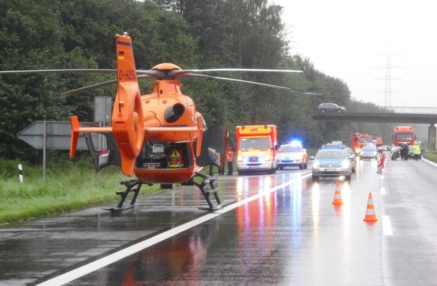 Bottrop; Gegen 15:15 Uhr musste die Feuerwehr Bottrop zu einem Verkehrsunfall auf der A31in Fahrtrichtung Emden ausrücken. In Höhe der Anschlussstelle Bottrop-Kirchhellen wurde eine sich auf der Fahrbahn befindliche Person von einem LKW erfasst. Die Person wurde mit schweren Verletzungen vom Rettungsdienst versorgt und im Anschluss mit einem Rettungshubschrauber in eine Unfallklinik geflogen. Der LKW Fahrer blieb bei dem Unfall unverletzt. Für Start und Landung des Hubschraubers musste die A31 in beiden Fahrtrichtungen kurzzeitig gesperrt werden. Für Fassungslosigkeit an der Einsatzstelle sorgte ein Reisebus der auf der Gegenfahrbahn im fließenden Verkehr auf dem Standstreifen anhielt, offensichtlich um seinen Fahrgästen einen Blick auf die Unfallstelle zu ermöglichen. Die Einsatzkräfte konnten mehrere Fahrgäste beobachten, die durch die Scheiben des Busses die Einsatzstelle filmten beziehungsweise fotografierten. Bevor die Polizei den Busfahrer zur Rede stellen konnte entfernte sich dieser von der Einsatzstelle. Die Feuerwehr Bottrop war mit 11 Einsatzkräften und einer Notärztin vor Ort. Gegen 16:15 Uhr war der Einsatz für die Feuerwehr beendet. (Ln)
