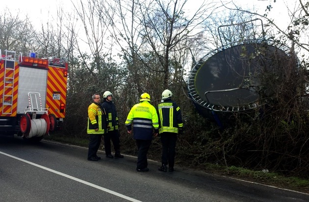 Den kuriosesten Einsatz fuhr die Feuerwehr um 16:12 Uhr: Die Leitstelle alarmierte mit dem Stichwort "Sturmschaden" an die Ratinger Straße / Ortsausgang Hofermühle - der Grund: Ein fliegendes Trampolin. Das Sportgerät mit einem Durchmesser von zirka 2,5 Metern und einer Gestellhöhe von rund 2 Metern wurde vom Wind einige Meter vom Grundstück geweht und landete schließlich im Gartenzaun. Von dort aus drohte es auf die Ratinger Straße zu stürzen. Die Einsatzkräfte zogen das Trampolin mit einem Einreißhaken und Manneskraft zurück auf das Grundstück und sicherten das Gerät gegen einen erneuten Abflug.