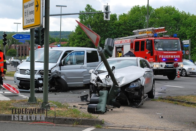Bei einem Verkehrsunfall auf der Dortmunder Straße, in Höhe der Autobahnauffahrt Hagen, kam es heute Vormittag zu einem Verkehrsunfall, bei dem zwei Personen verletzt wurden. Die Unfallstelle wurde von der Feuerwehr abgesichert. Nachdem die Verletzten vom Rettungsdienst versorgt waren, wurden sie in ein Iserlohner Krankenhaus transportiert. Der defekte Ampelmast musste von der Feuerwehr entfernt werden.