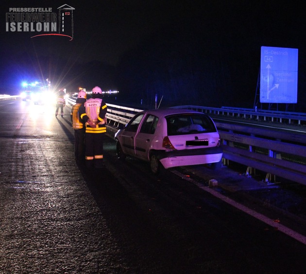 Zu einem Verkehrsunfall auf der Autobahn 46, zwischen Iserlohn-Zentrum und Iserlohn- Seilersee in Fahrtrichtung Hemer, wurden um 21:05 Uhr Feuerwehr und Rettungsdienst alarmiert. Ein Fahrzeug war aus bisher ungeklärter Ursache in die Mittelleitplanke gefahren, drehte sich und blieb entgegen der Fahrtrichtung auf der linken Spur stehen. Die Berufsfeuerwehr sicherte die Unfallstelle ab und beseitigte Trümmerteile von den Fahrbahnen. Die zwei Insassen des Unfallfahrzeugs wurden vom Rettungsdienst versorgt und leicht verletzt in ein Iserlohner Krankenhaus transportiert. Die Autobahn in Fahrtrichtung Hemer war etwa 20 Minuten voll gesperrt. Danach konnte der Verkehr einspurig an der Unfallstelle vorbei geführt werden.