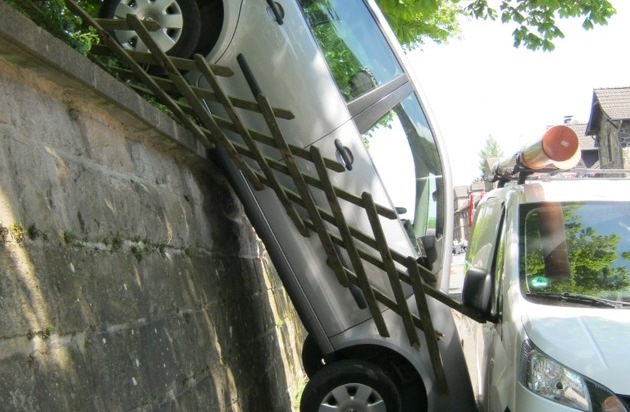 An der Wulfeistraße in Lasbeck machte sich gestern Mittag ein PKW selbstständig. Das Fahrzeug rollte einen Hang hinab, durchbrach einen Jägerzaun und stürzte eine Mauer hinunter. Der PKW blieb senkrecht zwischen der Mauer und einem geparkten Lieferwagen stecken. Verletzt wurde hierbei glücklicherweise niemand. Die alarmierte Feuerwehr sicherte den Unfallwagen mit einem Kettenzug. Die anschließende Bergung des Kleinwagens übernahm ein örtliches Abschleppunternehmen mit einem Kran.