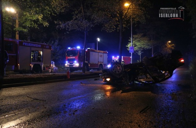 Um 22:35 Uhr wurde der Einsatzzentrale der Berufsfeuerwehr Iserlohn ein Verkehrsunfall auf der Dortmunder Straße in Fahrtrichtung Schwerte, zwischen der Karl Arnold Straße und der Friedhofstraße, gemeldet. Aus ungeklärter Ursache überschlug sich ein BMW und blieb auf dem Dach liegen. Die beiden Insassen konnten von Passanten vor Eintreffen der Feuerwehr aus dem Fahrzeug befreit werden. Beide Personen wurden mit schweren Verletzungen vom Rettungsdienst in Iserlohner Krankenhäuser transportiert. Da die Fahrbahnen der Dortmunder Straße in beiden Fahrtrichtungen von Trümmerteilen und Betriebsstoffen verunreinigt waren, wurden zwei Spezialunternehmen zur Reinigung der Fahrbahnen verständigt. Die Beamten der Berufsfeuerwehr unterstützten den Rettungsdienst, sicherten den Brandschutz und leuchteten die Einsatzstelle für die Unfallaufnahme der Polizei aus. Die Dortmunder Straße war in diesem Abschnitt für rund zwei Stunden voll gesperrt.