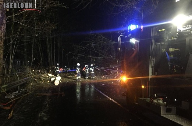 Am Sonntagabend (10.12.2017) um 22:00 Uhr wurde das Tanklöschfahrzeug (TLF) der Berufsfeuerwehr zu einem umgestürzten Baum zur Oeger Straße alarmiert. Vor Ort stellte sich heraus, dass mehrere Bäume umgestürzt waren und auch eine Oberleitung beschädigt wurde. Um die beschädigte Oberleitung kümmerte sich der Energieversorger. Zur Unterstützung der TLF Besatzung kam die Löschgruppe Letmathe der Freiwilligen Feuerwehr zur Einsatzstelle. Mit Hilfe von drei Kettensägen wurden die Bäume zersägt und an der Seite abgelegt. Um 00:30 Uhr war der Einsatz für die 17 Einsatzkräfte beendet.