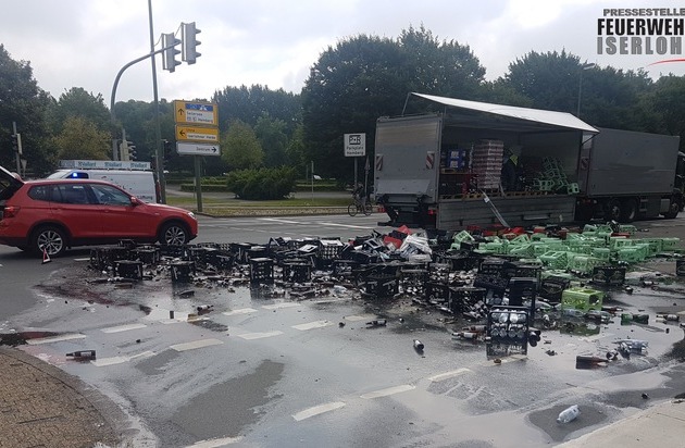 Gegen 11:30 Uhr bog ein Getränkelaster von der Hembergstraße auf die Baarstraße. Im Kreuzungsbereich zur Theodor-Fleitmann-Straße kippten die verschiedensten Getränkekisten aus dem LKW auf die Fahrbahn. Die alarmierten Einsatzkräfte der Berufsfeuerwehr sicherten zusammen mit der Polizei die "Unfallstelle" ab. Nach ersten unterstützenden Aufräumarbeiten wurde die Einsatzstelle an die Stadtbetriebe Iserlohn-Hemer (SIH) übergeben.