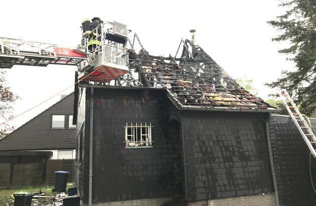 Das Gebäude ist durch den Brand voll zerstört und unbewohnbar. Der Kreisbrandmeister des Rheinisch-Bergischen Kreises machte sich vor Ort ein Bild von der Lage.