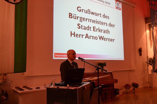 In seinem Grußwort bedankte sich Bürgermeister Arno Werner für die geleistete Arbeit im vergangenen Jahr. Hier hob er insbesondere den tagelangen Einsatz der Einsatzkräfte nach dem Pfingststurm "Ela" im Juni heraus, der nur mit umfassender Unterstützung von auswärtigen Feuerwehr- und THW-Einheiten aus ganz NRW zu leisten war. Die Amoktat am Neuenhausplatz in Unterfeldhaus sowie der Großbrand im September in Hilden forderte ebenfalls die ganze Schlagkraft der Feuerwehr Erkrath heraus.