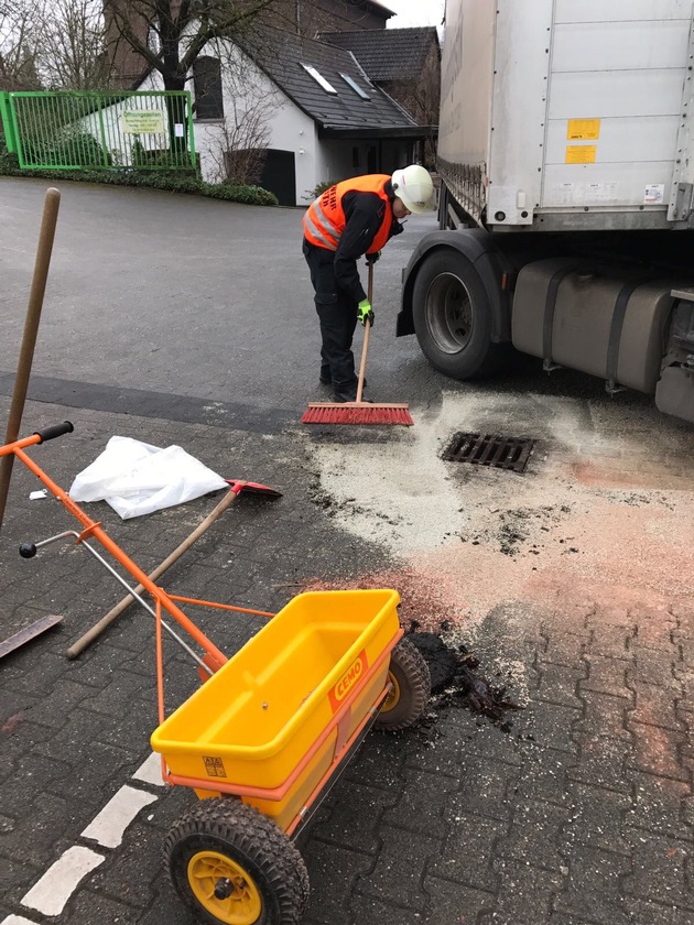 Durch die Kreisleitstelle wurde die Feuerwehr Erkrath am Dienstagmorgen zu einem Kraftstoffauslauf auf dem Parkplatz eines Raiffeisenmarktes in Unterfeldhaus alarmiert. Dort wurde bei einem Rangiervorgang die Kraftstoffleitung eines Lkw beschädigt. Da sich das Fahrzeug unmittelbar an einem Kanaleinlauf befand, drohte der auslaufende Kraftstoff in die Kanalisation zu gelangen. Durch das schnelle und beherzte Eingreifen von Mitarbeitern des Raiffeisenmarktes, die umgehend einen Wall aus Katzenstreu und einer Kunststoffplane um den Kanaleinlauf errichteten, konnte der Kraftstoffeinlauf in die Kanalisation erfolgreich verhindert werden. Die kontaminierte Fläche wurde von den Einsatzkräften nach der Bergung des Lkw abgestreut und das mit Kraftstoff kontaminierte Bindemittel aufgenommen und der Entsorgung zugeführt. Der Einsatz der Feuerwehr Erkrath, die mit drei Fahrzeugen und sieben Einsatzkräften vor Ort war, konnte nach ca. 70 Minuten beendet werden.