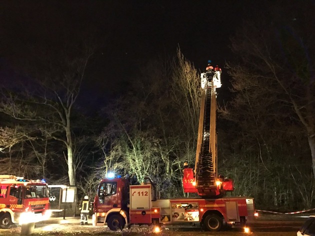 Das ab dem Nachmittag des Altweiberdonnerstags heranziehende Sturmtief "Thomas" bescherte den hauptamtlichen Einsatzkräften der Feuerwehr Erkrath bis in die Nacht hinein insgesamt sieben sturmbedingte Einsätze. Bei fünf Einsätzen handelte es sich um umgestürzte Bäume, die Gehwege und Fahrbahnen blockierten. So musste an der Sandheider Straße ein auf Fahrbahn und Gehweg gestürzter Baum beseitigt und ein weiterer Baum, der sich in der Baumkrone eines anderen Baumes verfangen hatte über die Drehleiter mittels Motorkettensäge abgetragen werden. Weitere umgestürzte Bäume gab es in Hochdahl auf der Hüttenstraße, Am Hühnerbach und auf der Stahlenhauser Straße. Auf der Ernst-Barlach-Straße in Alt-Erkrath beschädigte ein umstürzender Baum eine Straßenlaterne, sodass die Stadtwerke ebenfalls tätig werden mussten. Auch hier lag der Baum quer über der Fahrbahn und musste unter Vornahme einer Motorkettensäge beseitigt werden.