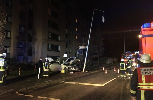 Um 23:57 Uhr wurde eine Löschgruppe des Löschzuges Alt-Erkrath sowie die hauptamtliche Wache und der Rettungsdienst zu einem schweren Verkehrsunfall mit einer eingeklemmten Person auf die Düsseldorfer Straße in Höhe des Rosenhofes alarmiert. Dort war ein Taxi frontal gegen eine Straßenlaterne geprallt. Entgegen der ersten Meldung war der schwerverletzte Taxifahrer glücklicherweise nicht in seinem Fahrzeug eingeklemmt und war bereits von Ersthelfern befreit worden. Die Feuerwehr musste lediglich Sicherungsmaßnahmen durchführen und die beschädigte Straßenlaterne demontieren. Der schwerverletzte Taxifahrer wurde unter Notarztbegleitung mit einem Rettungswagen in die Uniklinik Düsseldorf transportiert. Für einen Ersthelfer musste im Laufe des Einsatzes ein Notfallseelsorger angefordert werden. Der Einsatz der Feuerwehr war gegen 02:15 Uhr beendet.