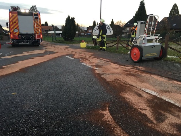 Aufgeladen auf einem Abschleppfahrzeug hatte der defekte PKW beim Abbiegen von der Kalkarer Straße auf die Koppelstraße Öl verloren. Zunächst hatte der Mitarbeiter des Abschleppunternehmens selber versucht die Ölspur abzustreuen, alarmierte aber wegen der Länge doch die Feuerwehr.