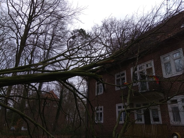 FW-KLE: Sturmtief "Friederike": Erste Bilanz der Freiwilligen Feuerwehr Bedburg-Hau - Bahnstrecke Krefeld - Kleve gesperrt - Baum auf Mehrfamilienhaus