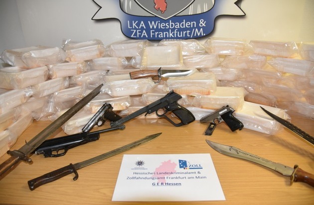 Zunächst hatten Bedienstete der Kontrolleinheit für Verkehrswege - KEV - des Hauptzollamts Gießen in den Mittagsstunden des 04.10.2017 auf Höhe der Raststätte Bad Camberg (A3, Fahrtrichtung Süden) einen niederländischen PKW kontrolliert. Im Fahrzeug des 56-jährigen Niederländers entdeckten sie 67 Kilogramm Amphetamin. Zur weiteren Aufklärung des Falles übernahm die Gemeinsame Ermittlungsgruppe Rauschgift - GER - des Zollfahndungsamts Frankfurt und des Hessischen Landeskriminalamts die weiteren Ermittlungen. Im weiteren Verlauf wurde der mutmaßliche Übergabeort des Rauschgifts im Raum Groß-Gerau festgestellt. Hier griffen die Fahnder am frühen Abend zu und nahmen zwei Deutsche im Alter von 37 (wohnhaft in Groß-Gerau) und 47 Jahren (wohnhaft in Büttelborn) fest. Die anschließenden Ermittlungen führten die Ermittler auf die Spur des mutmaßlichen Auftraggebers des Rauschgiftdeals. Bei diesem handelt es sich um einen "alten Bekannten", ein 32-jähriger Deutscher aus Büttelborn. Auf Anordnung der Staatsanwaltschaft Darmstadt nahmen Beamte des Polizeipräsidiums Frankfurt den Mann in seiner Wohnung fest. Bei der anschließenden Durchsuchung wurden zwei Pistolen, eine davon durchgeladen mit insgesamt fünf Schuss Munition, eine Luftdruckpistole, ein Waffenteil, sechs Hieb- und Stichwaffen und zwei Stielhandgranaten, die sich im Nachgang als Attrappen herausstellten, sichergestellt. Auf Antrag der Staatsanwaltschaft ordneten die Amtsgerichte in Limburg (Kurier) und Darmstadt (Hintermänner) am 05.10.2017 gegen alle vier Beschuldigten Untersuchungshaft an.