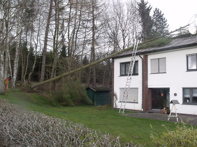 Im Herdringer Stockhausenweg, in der Kardinal-Jäger-Straße auf Bergheim und in Niedereimer in der Straße Zum Eichhahn beschädigten umgestürzte Bäume Hausdächer. Die Wehrleute befreiten die Gebäude von dieser ungewollten Last. Zudem beschädigte der starke Wind weitere Hausdächer in Arnsberg in der Straße Unterm Römberge und in der Herdringer Dungestraße. Außerdem löste der Sturm das Dach eines Carports am Neheimer Besenberg. Auch hier war der Einsatz der Feuerwehr erforderlich, um weitere Beschädigungen an den Gebäuden und in der Umgebung durch umherfliegende Dachteile zu verhindern.