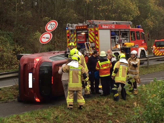 Die Feuerwehr der Kupferstadt Stolberg wurde am heutigen Freitag um 10.54 Uhr zu einem schweren Verkehrsunfall auf die Aachener Straße (zwischen Büsbach und Gedautal) gerufen. Ein PKW-Fahrer kam Eingangs einer leichten Linkskurve mit seinem Fahrzeug von der Fahrbahn ab, überfuhr die Leitplanke und kippte auf dem Bürgersteig/Radweg auf die Seite. Hierbei wurde er in seinem Wagen eingeklemmt. Aufgrund der Notrufmeldung wurden umgehend die Kräfte der Feuer- und Rettungswache, des 2. Löschzuges, des Rettungsdienstes und der Notarzt alarmiert. Ein zufällig an der Einsatzstelle vorbeikommender Notarzt sichtete und versorgte den Patienten bereits vor Eintreffen der Feuerwehr. Die Einsatzkräfte unter Leitung von Stadtbrandinspektor Andreas Dovern erreichten aufgrund der kurzen Anfahrt die Einsatzstelle sehr zügig. Sofort nach dem Eintreffen wurde die Unfallstelle gegen den fließenden Verkehr abgesichert, der verunfallte PKW gesichert und stabilisiert, der Brandschutz sichergestellt und die technische Rettung des Patienten vorbereitet. Nachdem die erste Versorgung des Fahrers durchgeführt war, entschieden die Einsatzkräfte in Absprache mit dem Notarzt, das Fahrzeug wieder auf die Räder zu stellen, damit der Patient schnellstmöglich aus seiner misslichen Lage befreit werden konnte. Nachdem der Wagen wieder stand, konnte der Fahrer zügig befreit und zur weiteren Behandlung in ein Krankenhaus transportiert werden. Die Einsatzmaßnahmen der Feuerwehr dauerten rund 90 Minuten an.