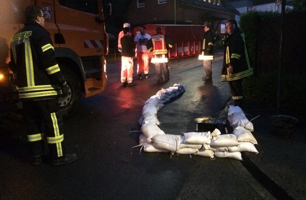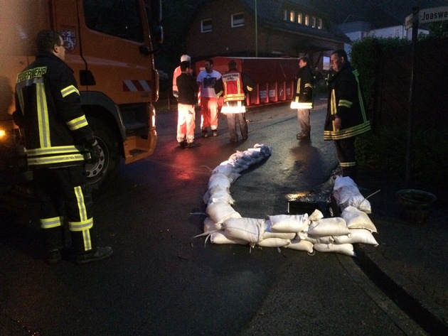 Ein kurzer, aber sehr heftiger Starkregen beschäftigte die Feuerwehr der Kupferstadt Stolberg von Montagabend bis tief in die Nacht. Die letzten Einsatzkräfte kehrten gegen 1 Uhr zu ihren Standorten zurück. Ab 20 Uhr standen die Notruftelefone in der Einsatzzentrale nicht mehr still. Den Anfang der Hilfeleistungseinsätze wegen der Wassermassen machte das Tiefental im Ortsteil Büsbach. Mehrere verstopfte Kanaleinläufe mussten von Laub und Schlamm befreit werden, damit das angestaute Wasser wieder von der Straße ablaufen konnte. Der 5. Löschzug mit den Löschgruppen Gressenich, Schevenhütte und Werth wurde ab 20.24 Uhr in den Ortsteil Schevenhütte in die Straße "Lamersiefen" und Nideggener Straße alarmiert. Gewaltige Wassermassen ließen den Lamersiefen über die Ufer treten. Das vom Wasser mitgeführte Laub, Äste und auch Schlamm verstopfte Kanalrohre und ließ das Wasser über die Straße in mehrere Keller laufen. Die Einsatzkräfte pumpten die Keller leer und bauten mit Sandsäcken mehrere Deiche um die Häuser zu schützen und das Wasser abzuleiten. Der Kanalbetriebshof war dort ebenfalls tätig. In der Fischbachstraße wurde die Löschgruppe Vicht ab 20.45 Uhr tätig. Von der Straße "Kluckenstein" aus, suchte sich das Wasser bergab seinen Weg durch den Keller und die Garage eines Wohnhauses. Aufgestautes Wasser wurde mit einer Tauchpumpe abgepumpt. Anschließend wurde die Straße von Schlamm und Geröll befreit. Kurze Zeit später wurden die Vichter Feuerwehrleute wieder in die Fischbachstraße gerufen. Am Ende der Straße hatte sich ein kleiner Bachlauf zum reißenden Strom entwickelt und die Straße überspült. Auch im Kanal staute sich das Wasser zurück und trat über einen Kanaleinlauf wieder aus. Zum Schutz eines Wohnhauses wurde mit Sandsäcken ein Wall errichtet. Nachdem dieser Einsatz abgearbeitet war, ging es zur Mulartshütter Straße. Hier wurden Schlamm und Geröll von der Straße entfernt. Gegen 22 Uhr wurde die Löschgruppe Atsch zum Stolberger Hauptbahnhof entsandt. Die Unterführung zu den Gleisen stand unter Wasser. Mit einer Tauchpumpe wurde das Wasser abgepumpt. Bereits am Montagnachmittag mussten Ölspuren über mehrere Kilometer beseitigt werden. Hier waren neben den Einsatzkräften der Hauptwache die Löschgruppen Donnerberg und Mausbach im Einsatz.