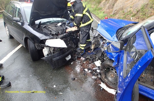 Viel zu tun für die Rettungskräfte gab es in den Morgenstunden des heutigen Donnerstages in Plettenberg. Neben zahlreichen für den Rettungsdienst gab es auch jede Menge Arbeit für die Feuerwehr. Zunächst wurden gegen 08:30 Uhr die beruflichen Kräfte der Hauptwache inklusive Führungsdienst, sowie der Rüstzug der ehrenamtlichen Kräfte aus Ohle zu einem schweren Verkehrsunfall in die Oestertalstraße alarmiert. Dort waren zwei PKW frontal auf der L697 kollidiert. Die erstlautende Meldung "Person im Fahrzeug eingeklemmt" bestätigte sich den Einsatzkräften von Feuerwehr und Polizei vor Ort glücklicherweise nicht. Dennoch mussten zwei Schwerverletzte von den Rettungskräften versorgt werden. Nach notärztlicher Behandlung an der Unfallstelle wurden beide PKW- Fahrer dem Krankenhaus Plettenberg zugeführt. Umfangreich gestalteten sich im Anschluss die Aufräum- und Bergungsarbeiten. Zudem unterstützte die Feuerwehr die Polizei bei der Unfallaufnahme mit der Drehleiter, um zur Rekonstruktion des Unfallherganges Bilder von oben auf die Unfallstelle machen zu können. Noch während des laufenden Einsatzes erhielten die Einsatzkräfte kurz nach 09:00 Uhr eine Brandmeldung vom Maiplatz. Passanten hatten dort eine verdächtige Rauchentwicklung aus einem Kanalschacht der Feuerwehrleitstelle gemeldet. Da die Hauptwache noch im Einsatz gebunden war, wurden der Führungsdienst und die örtliche zuständige Löschgruppe Stadtmitte der freiwilligen Feuerwehr alarmiert. Unrat brannte in dem Kanalschacht und konnte mittels Kleinlöschgerät rasch von den Blauröcken abgelöscht werden. Um 09:40 Uhr kam dann eine erneute Meldung über einen Verkehrsunfall auf der Hochbrücke in Eiringhausen. Wiederum rückten Führungsdienst und die noch an der Hauptwache befindliche Löschgruppe Stadtmitte nebst Rettungsdienst aus. Dort war es zu einem Auffahrunfall gekommen, wobei eine Person verletzt und ebenfalls dem Plettenberger Krankenhaus zugeführt wurde. Die Feuerwehr sicherte während des Einsatzes des Rettungsdienstes die Unfallstelle ab. Um 10:18 Uhr rückten die zwischenzeitlich vom Verkehrsunfall Oestertalstraße eingerückten Kräfte der Hauptwache unterstützt von den Kräften der Löschgruppe Stadtmitte zu einer Oelspur ebenfalls zur Hochbrücke aus. Ein bisher unbekanntes Fahrzeug hatte dort offensichtlich eine Ölspur verursacht. Die Feuerwehr streute die Ölspur ab und konnte gegen 11:00 Uhr wieder einrücken.