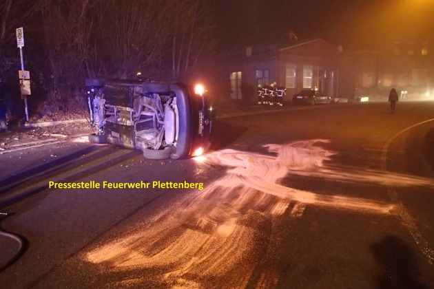 Der Feuerwehrleitstelle in Lüdenscheid wurde am Samstagnachmittag gegen 17:19 Uhr ein Verkehrsunfall in der "Blemcker-Kurve" im Ortsteil Blemcke gemeldet. Aufgrund des Meldebildes durch den Anrufer, wurden die haupt- und ehrenamtlichen Kräfte der Feuerwehr Plettenberg mit dem Einsatzsstichwort "eingeklemmte Person" alarmiert. Als die ersten Einsatzkräfte der Feuer- und Rettungswache am Einsatzort eintrafen, bestätigte sich die Meldung, dass eine Person im PKW eingeklemmt sein sollte glücklicherweise nicht. Der Fahrer war mit seinem Fahrzeug war aus noch nicht geklärter Ursache aus Richtung Rönkhausen kommend in eine Böschung geraten, überschlug sich, und blieb auf der Seite liegen. Der Fahrer konnte sich mit eigenen Kräften aus seinem völlig zerstörten Fahrzeug selbst befreien. Sämtliche Airbags des Fahrzeuges hatten ausgelöst. Nach notärztlicher Behandlung wurde der Fahrer zur weiteren Versorgung mit dem Rettungswagen der Feuerwehr ins Plettenberger Krankenhaus gebracht. Die Feuerwehr indes sicherte die Unfallstelle ab, stellte den Brandschutz sicher, und nahm mit Bindemittel auslaufende Betriebsstoffe auf. Für die Unfallaufnahme durch die Polizei wurde die Einsatzstelle großflächig ausgeleuchtet. Nachdem das Fahrzeug wieder aufgerichtet wurde, konnte die Straße wieder für den Straßenverkehr freigegeben werden. Nach einer knappen Stunde rückten die Rettungskräfte in ihre Standorte ein. Im Einsatz waren neben den hauptamtlichen Mitarbeitern der Feuer- und Rettungswache, auch die ehrenamtlichen Kräfte der Löschgruppen aus Eiringhausen und Ohle. Über die genaue Unfallursache und Höhe des entstandenen Sachschadens kann die Feuerwehr keine Auskunft geben.