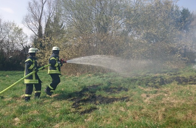 Länger dauerte der Einsatz am Dornberg. Bei Eintreffen nahmen Anwohner die Einsatzkräfte in Empfang und wiesen den Gruppenführer ein. Ein Flächenbrand mit rund 200 m² Ausdehnung konnte mit Hilfe eines C-Rohrs schnell eingegrenzt und gelöscht werden. Da mehrere kleinere Brandstellen während der Löscharbeiten gefunden wurden, erhielt ein Trupp den Auftrag, ein nahes Waldstück um den Schützenplatz am Dornberg nach weiteren Glutnestern abzusuchen. Zudem gab es Hinweise aus der Nachbarschaft, dass es im Waldstück auch brennen würde. Die Einsatzkräfte wurden schnell fündig und legten eine Schlauchleitung vom Dornberg bis zum Schützenplatz. Auch hier konnte die ca. 200 m² große Waldfläche schnell unter Kontrolle gebracht werden. Das Legen der Schlauchleitung sowie die Aufräumarbeiten beschäftigten die 16 Einsatzkräfte allerdings gut zwei Stunden. Für diese Zeit war der Dornberg gesperrt.