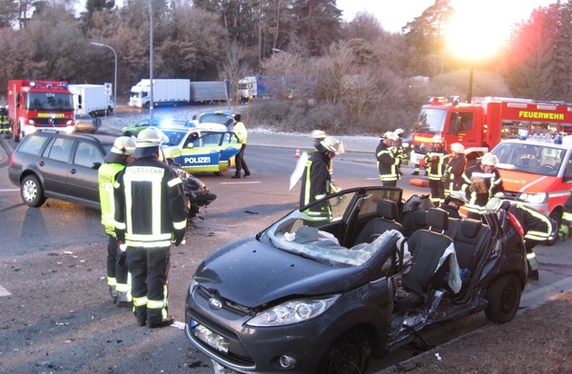 Zu einem Verkehrsunfall mit zwei schwerverletzten Personen wurden am Mittwochmorgen gegen 06:22 Uhr die Feuerwehr Nagold alarmiert. Gemeldet wurde ein Verkehrsunfall im Kreuzungsbereich L 361 Ecke Graf-Zeppelinstraße zwischen Nagold und Mötzingen mit mehreren Fahrzeugen und eingeklemmten Personen. Beim Eintreffen der ersten Einsatzkräfte wurden zwei verunfallte Fahrzeuge vorgefunden; in einem Fahrzeug war der Fahrzeugführer noch eingeklemmt. Mit hydraulischem Rettungsgerät wurde die Tür geöffnet sowie das Dach abgenommen. Somit konnte eine patientenschonende Rettung durchgeführt werden. Aufgrund der schweren Verletzungen wurde die Person mit dem Rettungshubschrauber nach Tübingen geflogen. Der andere Verkehrsteilnehmer wurde mit dem Rettungswagen in das Krankenhaus Nagold gebracht. Während der Rettungs- und Bergungsmaßnahmen, sowie für die Fahrbahnreinigung und Unfallaufnahme wurde die L361 in Richtung Mötzingen in beide Richtungen für zwei Stunden voll gesperrt. Bei der am Unfall beteiligten Fahrzeuge entstand Totalschaden und diese mussten von der Unfallstelle abgeschleppt werden. Die Feuerwehr Nagold war mit 24 Einsatzkräften und fünf Fahrzeugen vor Ort. Ebenfalls an der Einsatzstelle waren die Besatzung eines Rettungshubschraubers aus Villingen-Schwenningen, zwei Rettungswagen und ein Notarzt sowie die Polizei mit vier Fahrzeugen und acht Polizeibeamten. Für den genauen Unfallhergang und die Schadenshöhe hat die Polizei die Ermittlungen aufgenommen.
