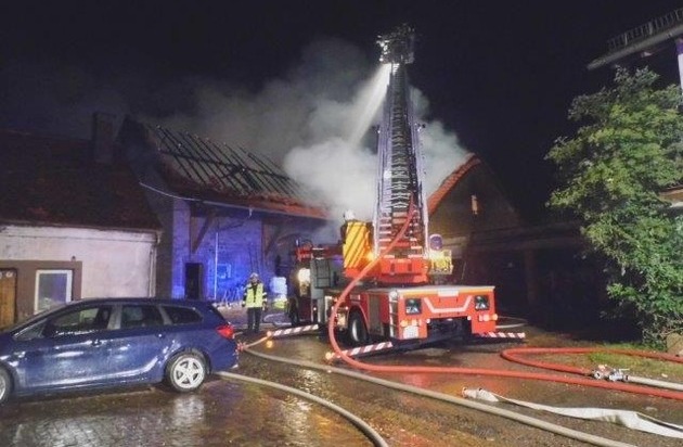 Ein Blitzeinschlag setzte den Dachstuhl einer großen Scheune in Brand. Darin waren mehrere hochwertige landwirtschaftlichen Maschinen untergestellt. Diese sind den Flammen zum Opfer gefallen. Eine Gefahr für Mensch oder Tier hat zu keinem Zeitpunkt bestanden. Die Feuerwehr ist aktuell (10.30 h) noch vor Ort. Die Brandwachen löschen Glutnester. In der Nacht war die Wehr mit 10 Fahrzeugen und mehr als 35 Männern im Einsatz. Der geschätzte Sachschaden dürfte im fünfstelligen Bereich liegen.