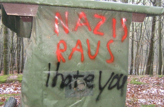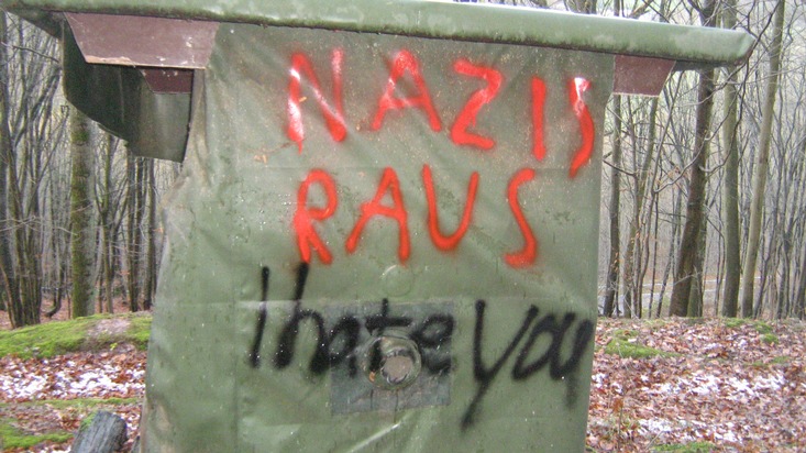 An vier Örtlichkeiten in der Gemarkung sind in den letzten Tagen Fahrschmierereien aufgetragen worden. In den Farben rot, schwarz, blau und weiß wurden die Texte aufgesprüht. Der Schaden liegt insgesamt bei etwa 2.000 Euro. Die Sachbeschädigungen wurden zwischen dem 10. und 23. November vorgenommen. Einige Schriftzeichen und "FCK" wurden an der Grillhütte "Friedelsruhe" vorgefunden (wir berichteten bereits). Aktuell wurde gemeldet, dass sich an der Brunnenanlage am Radweg Richtung Wolfstein an der Wand mehrere Motive befinden, so unter anderem "FCK" und "Ich war hier - 4.9.1919". Auf die Ruhebank am Radweg wurde geschrieben: "Wir bekommen Euch alle!!!!! (Nazis)". Am Mittwoch gemeldet wurde eine Schmieraktion an dem Hochsitz in der Gewanne Eisenknopf - Wolfstein. Dort wurde eine Abdeckplane in rot und schwarz mit der Aufschrift "Nazis raus" und "I hate you" verschmiert. Die Polizei in Lauterecken bittet um Hinweise zu dem Schmierfink unter Telefon-Nummer 06382 911 0.