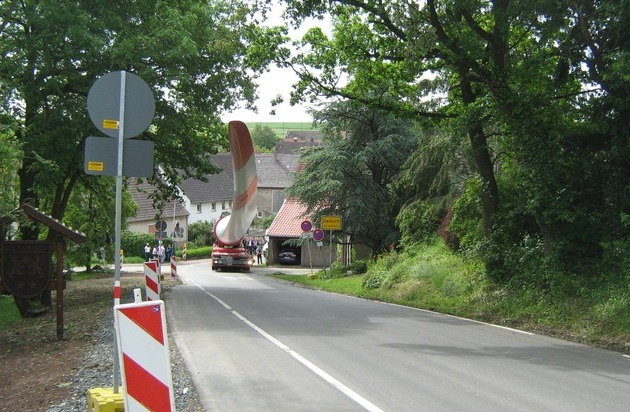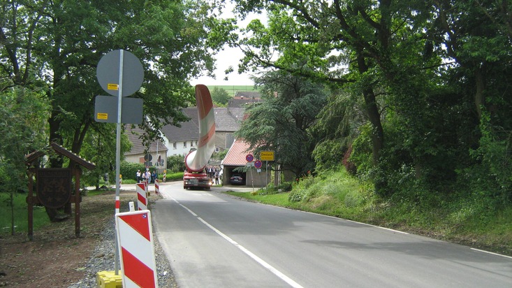 Die Begleitung von Schwertransporten gehört zum Alltag der Polizei. Besonders schwer, besonders breit oder lang sind die grundsätzlichen Problemsituationen, die zu berücksichtigen sind. Der Transport der Rotorflügel zum Windpark "Bärweiler/Jeckenbach" hatte die Besonderheiten "besonders langsam" und "besonders interessant". Die Rotorblätter wurden einzeln auf einem sogenannten Selbstfahrer transportiert. Das Spezialfahrzeug ohne Führerhaus wird von außen von seinem Fahrer zu Fuß per Fernsteuerung gelenkt. Alle acht Achsen sind separat lenkbar. Der an einem Gelenk montierte Rotor kann in Engpässen bis zur senkrechten Stellung aufgerichtet und um die Längsachse gedreht werden. So kann der gebogene Flügel den örtlichen Gegebenheiten entsprechend ausgerichtet werden. Dies erübrigt zum Beispiel in Ortschaften den Einsatz von großen Kränen, die die Teile in Engpässen über ein Haus heben und auf der anderen Seite wieder aufladen. Neben sechs Flügeln für die beiden Windräder wurden auch die obersten Teile des Turms mit diesem Fahrzeug zum Windpark gebracht. Für die insgesamt acht Fahrten wurde in den letzten Tagen jeweils die B 420 für zwanzig Minuten voll gesperrt. Der Transport in Schrittgeschwindigkeit verlief vom Verladeplatz am Meisenheimer Schwimmbad bis zur Einmündung der K 66 Richtung Desloch. Über Desloch ging es weiter bis zum Windpark. Die Fahrt dauerte circa 3,5 Stunden und beschäftigte für diese Zeit auch die Polizei mit jeweils drei Beamten. Die Rückfahrt vom Windpark zum Verladeplatz wurde ohne Polizeibegleitung bewältigt. Am Donnerstag, dem 02. Juni 2016 ist der vorerst letzte Transport eines Rotorblattes in dieser Art und Weise vorgesehen. Die B 420 wird in der Zeit von etwa 08:30 Uhr bis 09:00 Uhr tangiert sein. Wie bisher wird der PKW-Verkehr durch die Ortslage von Meisenheim umgeleitet. Lastkraftwagen über 7,5 Tonnen oder mit Anhänger müssen warten. Für Einsatzleiter Erik Hippchen von der Polizeiinspektion Lauterecken war die Durchfahrt des Transportes in der Ortslage Desloch die herausragende Besonderheit. Dort konnte der Rotor abgesenkt unter den Baumkronen hindurchgeführt werden ohne dass die zu schützenden Kastanienbäume beschädigt wurden. "Das Feingefühl des Fahrers war bemerkenswert. Er kann das riesige Gefährt mit seiner Ladung zentimetergenau steuern".