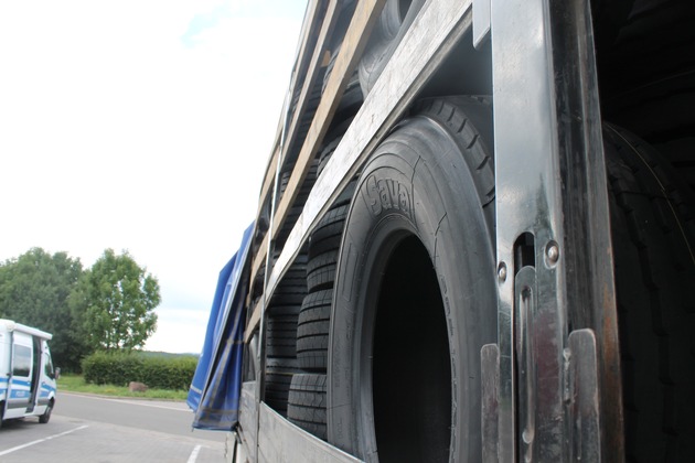 Beamte der Schwerverkehrsüberwachung kontrollierten am Mittwochnachmittag einen osteuropäischen Sattelzug. Das Fahrzeug war mit 15 Tonnen LKW-Reifen beladen. Es konnte festgestellt werden, dass der für einen Reifentransport verwendete Sattelanhänger völlig ungeeignet war. Die Reifen hatten sich stark in die seitlichen Schiebeplanen gedrückt, sodass das Fahrzeug erheblich zu breit war. Weiterhin wurden noch gravierende technische Mängel und -bis zur Karkasse- abgefahrene Reifen an dem Fahrzeug festgestellt. Aus diesen Gründen wurde die Weiterfahrt bis zur verkehrssicheren Instandsetzung des Fahrzeuges untersagt. Weiterhin müssen die Reifen umgeladen werden. Neben mehreren Bußgeldverfahren wurde auch ein Verfahren der Vermögensabschöpfung gegen den Fahrzeughalter eingeleitet.
