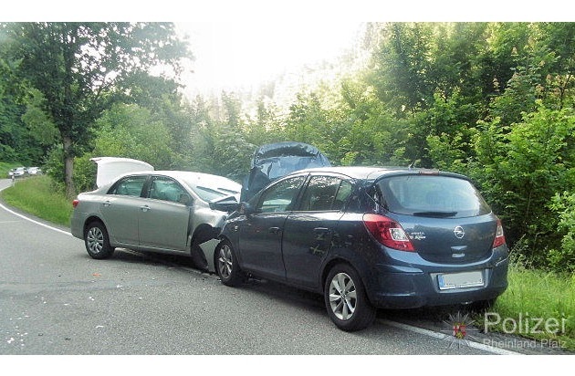 Ein waghalsiges Überholmanöver hat am frühen Montagmorgen auf der L500 zu einem Unfall geführt. Ein 23-jähriger Autofahrer, der aus Richtung Trippstadt kommend auf dem Weg in Richtung B270 war, überholte in einer Kurve und trotz Gegenverkehr einen vor ihm fahrenden Bus. Dabei kollidierte er mit seinem Toyota Corolla mit dem entgegen kommenden Opel Corsa einer 41-jährigen Frau.