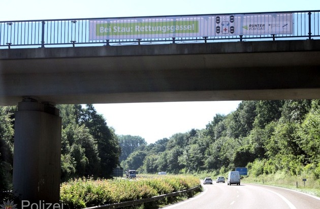 Jeder kann Opfer eines Verkehrsunfalls oder eines sonstigen ärztlichen Notfalls werden. Egal wie schwierig die Unfall- oder Gefahrenlage ist, die Hilfe muss innerhalb kürzester Zeit eintreffen. Je schwerer die Verletzungen oder der Notfall, umso schneller wird auch die Hilfe benötigt. Aber da hat sich bereits ein Hindernis aufgetan! Auf Autobahnen entsteht sofort ein Stau. Beschleunigt wird dieses Verkehrsphänomen in der Westpfalz durch die derzeitige Baustellensituation. Schwere Verkehrsunfälle sind zwar nicht alltäglich, häufen sich aber. Die Koordination der Einsatzkräfte von Polizei, Rettungsdienst und anderen Hilfsdiensten erfordert angesichts dieser Situation eine hohe Flexibilität. Unter Zeitdruck rechtzeitig an den Einsatzort zu kommen ist gar nicht so einfach. Obwohl eigentlich den meisten Verkehrsteilnehmer klar ist, dass bei Blaulicht und Martinshorn die Fahrbahn frei zu machen ist, funktioniert es nicht. Rettungsgassen müssen regelrecht erarbeitet werden und Fahrzeuge blockieren die Weiterfahrt. Autofahrer reagieren falsch, oft sind sie mit der Verkehrssituation überfordert, weil sie sich in einer Baustelle befinden, zu dicht aufgefahren sind und nicht mehr rangieren können. Mit der Kampagne "Rettungsgasse - freie Fahrt für Einsatzkräfte" sollen die Verkehrsteilnehmer zu diesem Thema sensibilisiert werden. Dazu wurden in Zusammenarbeit mit dem LBM an verschiedenen Stellen der Autobahnen 6, 62 und 63 Banner an Brückenbauwerken angebracht. Die Autobahnpolizei wird zudem im Rahmen ihrer Verkehrsüberwachung verstärkt das Verhalten der Verkehrsteilnehmer im Blick haben, denn häufig wird die Bildung einer Rettungsgasse durch zu geringen Abstand, aggressive und rücksichtslose Fahrzeugführer oder auch durch zu schnelles Fahren verhindert.