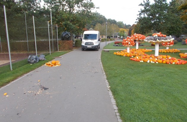 Unbekannte verschafften sich in der Nacht Zutritt zu dem Areal, auf dem zurzeit eine Kürbis-Ausstellung stattfindet. Im Bereich der Schlachthaus-Halle, unter der Berliner Brücke, stießen die Vandalen einen Blumenstock um und beschädigten drei Riesen-Kürbisse. Sie brachen das Fruchtfleisch der Kürbisse heraus. Außerdem zerstörten sie eine aus Kürbissen bestehende Fliegenpilzfigur. Etwa 50 mit Kabelbindern befestigte Kürbisse rissen sie ab und zerschmetterten die Früchte auf dem Boden. Ein Hinweisschild wurde ebenfalls herausgerissen und in ein Blumenbeet geworfen. Die Polizei ermittelt wegen Sachbeschädigung.