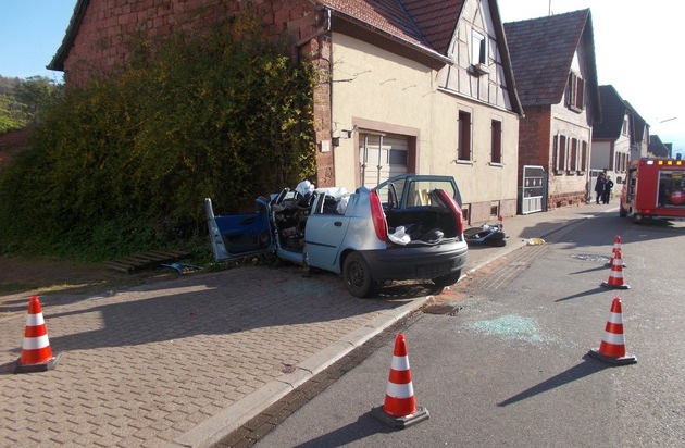 Bei einem Verkehrsunfall am Sonntagmorgen wurde ein 24-jähriger Südpfälzer schwer verletzt. Der verunfallte Pkw-Fahrer kam in einer Fahrbahnschwenkung in der Ortsdurchfahrt Queichhambach nach links von der Straße ab und prallte ungebremst frontal in eine Hausfassade. Durch den Aufprall musste der Fahrer durch die Feuerwehr Annweiler aus seinem Pkw befreit werden und wurde schwer verletzt, u.a. Rippenfrakturen und Beckenbruch in ein Landauer Krankenhaus verbracht. Durch das THW und die Feuerwehr wurde die einsturzgefährdete Fassade stabilisiert. Wie sich im Verlaufe der Unfallaufnahme herausstellen sollte, war der 24-jährige Fahrer nicht im Besitz eines Führerscheins und er dürfte unter Einfluss von Betäubungsmitteln und Alkohol gewesen sein. Zudem war der Unfallwagen nicht ordnungsgemäß zugelassen.