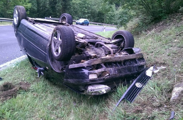 Gegen 18.55 h am gestrigen Montag, 24. August, befuhr eine 18 jährige Fahranfängerin aus der VG Gerolstein mit ihrem PKW die K 33 von Neroth kommend in Richtung Gees. In einer Linkskurve brach das Heck des Pkw auf Grund nicht angepasster Geschwindigkeit aus. Das Auto überschlug sich und blieb auf dem Grünstreifen neben dem rechten Fahrbahnrand auf dem Dach liegen. Am Fahrzeug entstand Totalschaden, die Fahrerin wurde nur leicht verletzt.