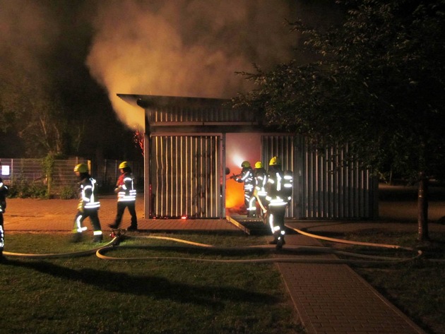 Aus bislang unbekannter Ursache geriet das Innere einer freistehenden Wellblechhütte in Brand, in welcher Müll in Containern gelagert wurde. Eine Brandstiftung kann nach bisherigem Stand der Ermittlungen nicht ausgeschlossen werden.