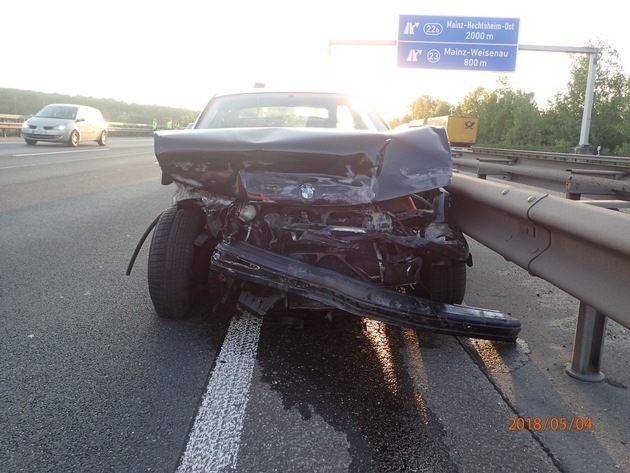 Auf der A60 in Fahrtrichtung Darmstadt ereignete sich am 04.05.2018 gegen 19:30 Uhr ein Verkehrsunfall kurz vor der AS Mainz-Laubenheim. Ein 19-jähriger Fahrer aus dem Rhein-Main-Gebiet kam aus bislang ungeklärten Gründen mit seinem BMW ins Schleudern. Er kollidierte zunächst mit der rechten Leitplanke, wurde daraufhin quer über Fahrbahn geschleudert und stieß frontal gegen die Mittelschutzplanke. Durch diesen Aufprall verlor er endgültig die Kontrolle über sein Fahrzeug und prallte gegen einen weiteren PKW, der durch die Kollision ebenfalls ins Schleudern geriet. Nach einem erneuten Aufprall gegen die rechte Leitplanke, kam der BMW-Fahrer schließlich auf dem linken von drei Fahrstreifen zum Stehen. Es wurden noch zwei weitere PKWs durch herumfliegende Fahrzeugteile beschädigt. Während der Unfallaufnahme musste der linke und der mittlere Fahrstreifen gesperrt werden. Der Verkehr konnte auf dem rechten Fahrstreifen vorbeifließen. Das Trümmerfeld erstreckte sich auf rund 150 Meter. Hierdurch entstand ein ca. 2km langer Rückstau. Der 19-jährige Fahrer zog sich bei dem Unfall glücklicherweise "nur" eine Platzwunde zu. Der Gesamtschaden beträgt ca. 30000EUR