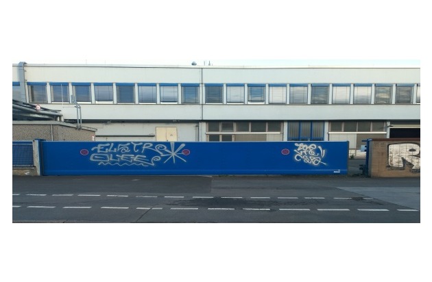 Freitag, 28.07.2017 Vermutlich von Donnerstag auf Freitag wurde eine Mauer in der Hattenbergstraße in Mainz-Mombach mit zwei großen TAG´s (Schriftzug-Graffiti) beschädigt. Unbekannte Täter haben in weißer Farbe zwei Schriftzüge auf die blaue Mauer der dort ansässigen Firma aufgebracht. Ob diese Schriftzüge mit den Graffiti aus der letzten Woche in Verbindung stehen, als ein Rettungswagen, vier Verkaufsanhänger und eine Wand in der Altstadt beschmiert wurden, muss noch ermittelt werden. (Das Foto ist nur in dieser Auflösung verfügbar)