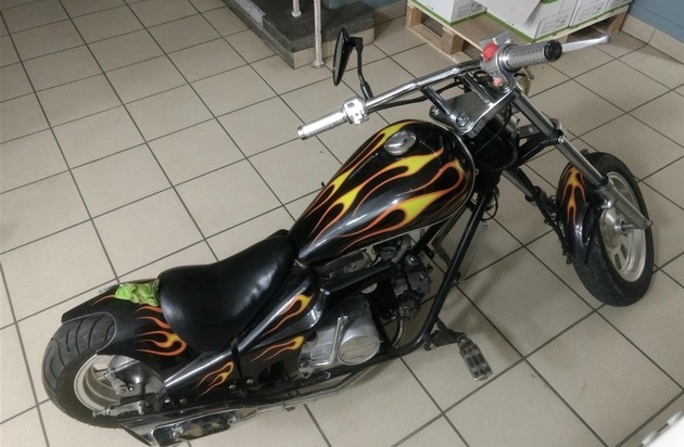 Am Samstag, dem 21.04.2018, fiel einer Funkstreife der PI Betzdorf gegen 00:45 Uhr in der Hauptstraße (K 119) in Steinebach ein sogenannter Mini-Chopper ohne Fahrlicht und Kennzeichen auf. Der Fahrer entzog sich der Kontrolle, indem er sein Krad nach einer kurzen Verfolgung am Straßenrand zurückließ und durch unwegsames Gelände zu Fuß flüchtete. Er warf zudem seinen schwarzen Motorradhelm weg. Am Lenker war ein schwarzes Halstuch mit dem Schriftzug "Black Seven Gang" befestigt. Die Polizei fragt in diesem Zusammenhang, wer Hinweise auf den Mini-Chopper und dessen Eigentümer geben kann. Ferner ergeht der Hinweis, dass Unfälle mit derartigen Fahrzeugen zu schweren Verletzungen führen können und etwaige geschädigte Personen auf ihren Kosten sitzen bleiben, weil keine Versicherung im Schadensfall die Haftung übernimmt.