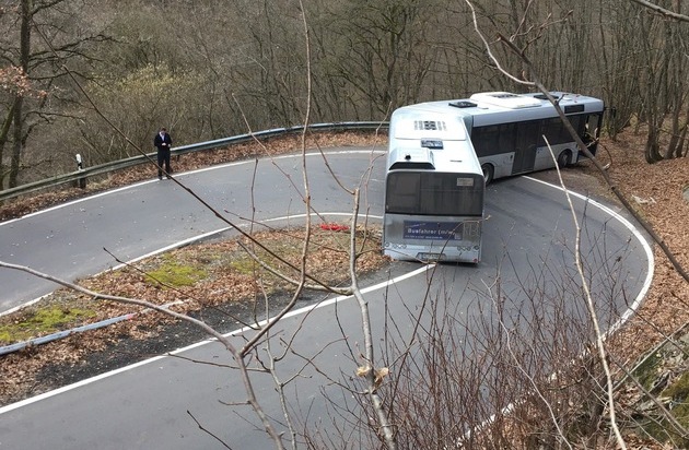 Am 02.03.2017 meldet sich gegen 10:47 Uhr ein Verkehrsteilnehmer und teilt mit, dass sich zwischen den Ortslagen STEINSBERG und GUTENACKER, Kreisstreife 37, KM 0,2 ein Bus festgefahren hätte. Bei der Überprüfung vor Ort konnten die eingesetzten Beamten einen GELENKBUS feststellen der sich in einer engen Linkskurve aufgrund seiner Überlänge (zirka 20 Meter), dort festgefahren hatte. Der aus dem Zulassungsgebiet Aachen stammende Bus sollte in die Nähe von Wiesbaden überführt werden, warum der 47 jährigen Busfahrer aus Mönchengladbach diesen Streckenabschnitt wählte, konnte nicht ermittelt werden. Offensichtlich verließ sich der Fahrer hier ausschließlich auf sein Pkw-Navigationsgerät und übersah mindestens zwei Durchfahrtsverbotsschilder. Der o.g. Streckenabschnitt wurde durch hinzugezogenen Straßenmeisterei Diez in beide Richtungen gesperrt. Die Sperrung dauert derzeit noch an. Der Fahrer wurde vor Ort verwarnt, der Schaden und die Abschleppkosten werden sich auf mind. 5000 Euro belaufen. POLIZEIINSPEKTION DIEZ - Telefon 06432/601-0 - E-Mail: pidiez@polizei.rlp.de ********************************************************************* ************************************************************