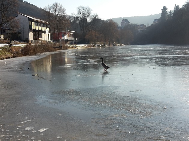 Die anhaltend unter dem Gefrierpunkt liegenden Temperaturen der letzten Tage haben nicht nur die Berge und Täler des Rhein-Lahn-Kreises in ein winterliches Antlitz gehüllt. Auch die Lahn selbst spiegelt, mit inzwischen weitläufigen Eisflächen, die Schönheit der Jahreszeit wieder. Eben jene Flächen sind es jedoch, die von überwiegend jungen Spaziergängern betreten werden. So verlockend und scheinbar sicher diese Eisflächen auch wirken, so groß ist auch die Gefahr, die von ihnen ausgeht. Nur in ganz wenigen Bereichen ist die Eisschicht derart dick, dass ein bedenkenloses Betreten möglich wird. Die Polizei weist daher ausdrücklich darauf hin, dass die Lahn nicht begangen werden sollte. Zu groß ist die Gefahr eines Eisbruchs und dem damit verbundenen Einsinken in den kalten Fluss.