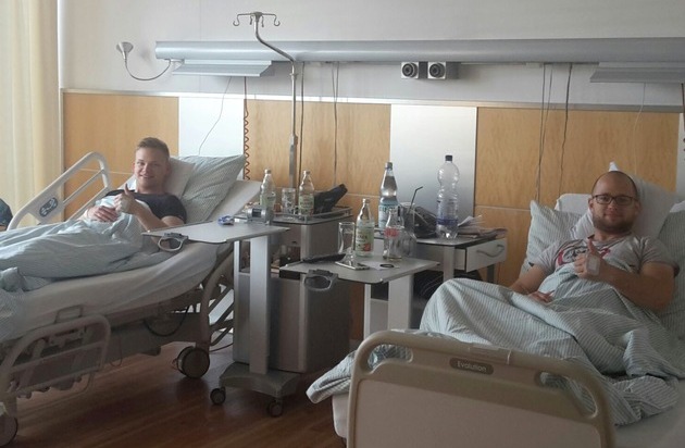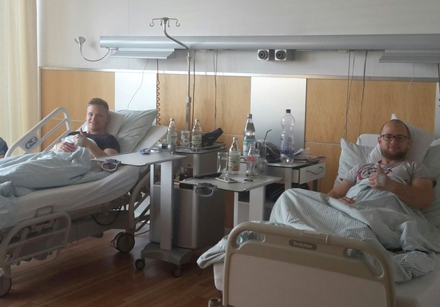 "Es ist schon ein überwältigendes Gefühl, einem schwerkranken Kind eine zweite Chance geben zu können", so das Fazit der beiden Polizeibeamten. Johannes Feigk, zurzeit im Bachelorstudiengang an der Hochschule der Polizei am Campus Hahn staunte nicht schlecht, als sich in der MediaPark Klinik in Köln sein Zimmernachbarn vorstellte. Es war Polizeikommissar Helge Hermann, der im April erfolgreich sein Polizeistudium am Hahn beendete. Was für ein Zufall! Schnell kamen die beiden ins Gespräch und es war klar, dass die Spende für beide eine Selbstverständlichkeit darstellte. "Wenn wir einem anderen Menschen helfen können, dann machen wir das; trotz gewissen Risiken und Schmerzen, die eine Operation zur Folge haben könnte." Beide ließen sich an der Hochschule der Polizei im Rahmen einer Typisierungsaktion, die regelmäßig am Campus Hahn durchgeführt wird, typisieren. Mitte des Jahres erhielt Polizeikommissaranwärter Feigk nun die Information, dass er als Spender in Frage käme. "Eine Frau eröffnete mir am Telefon, dass ich tatsächlich der geeignete Spender für einen Blutkrebspatienten sei und mittels "traditionellem" Spendeverfahren spenden solle", erinnert sich Feigk. Trotz Verunsicherung am Anfang stimmte er gleich der Knochenmarkspende zu. "Schließlich geht es ja hier um ein Menschenleben." Bereits wenige Tage später kam die Einladung zur Voruntersuchung in Köln und dann wurde der Termin festgelegt. Zu meiner großen Überraschung: "Er fiel genau auf meinen Geburtstag. Aber egal, feiern kann man auch später." Alles verlief gut, die Operation unter Vollnarkose dauerte etwa 20 Minuten. In der Folge wurden sie vom Klinikpersonal bestens verpflegt und versorgt. Schmerzmittel lehnten beide ab, da die Schmerzen erträglich waren. Wir waren uns sogar einig: "Das Entfernen des Venenzugangs tat mehr weh, als die Schmerzen nach der Operation! Aus diesem Grund möchten wir alle dazu ermutigen, sich registrieren zu lassen. Je mehr sich registrieren lassen, desto größer die Chance Leben zu retten."