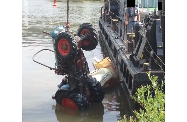 Bereits am Mittwoch, dem 06.06.2018 rollte ein Traktor im Bereich der Ortslage Pünderich in die Mosel. Grund war laut Aussage des Besitzers ein unbeabsichtigtes Lösen der Handbremse. Ein angehängter leerer Spritzbehälter verhinderte, dass der Traktor mit Anhänger komplett unterging. Das Fahrzeug konnte durch zwei unmittelbar in der Nähe befindliche Arbeitsboote des WSA Koblenz gesichert und anschließend mit Hilfe eines Tauchers von diesen geborgen werden. Während der Bergung wurde eine geringe Menge Betriebs- und Schmierstoffe freigesetzt. Die Schifffahrt wurde kurzfristig gesperrt.