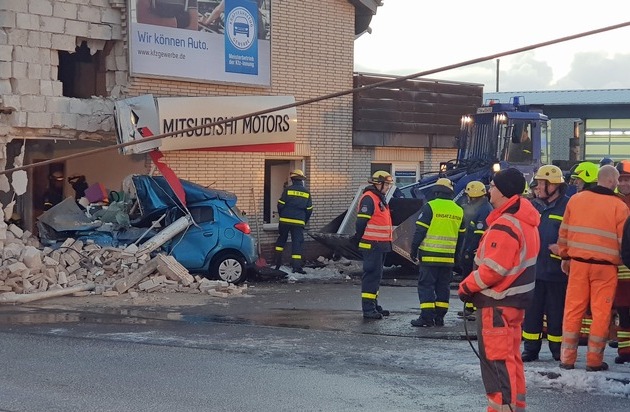 Ein Lkw-Fahrer verlor in der Nacht zu Freitag die Kontrolle über sein Fahrzeug. Der Sattelzug rammt mehrere Autos und kracht dann in ein Haus. Am Freitagmorgen wurden Einsatzkräfte aufgrund eines Unfalls nach Treia an der B 201 zwischen Schleswig und Husum gerufen. In Treia (Kreis Schleswig-Flensburg) an der B 201 war laut Polizei gegen drei Uhr ein Lastwagen - vermutlich wegen Straßenglätte - von der Fahrbahn abgekommen. Nachdem der Lkw 2 parkende Autos deformierte, krachte der Sattelzug in der Hauswand und verursachte ein Loch in der Hausmauer des Geschäftshauses über zwei Etagen. Das Haus wurde am Morgen von THW-Kräften aus Schleswig und Husum abgestützt, damit es nicht einstürzt. Insgesamt waren 23 ehrenamtliche Helferinnen und Helfer aus den Ortsverbänden Husum und Schleswig im Einsatz. Der Fahrer des Lkw wurde leicht verletzt. Im beschädigten Gebäude wurde zum Glück niemand verletzt. Die B 201 musste in diesem Bereich bis in die Mittagsstunden des Freitags gesperrt werden, auch weil der Lkw seine Ladung verloren hatte. Neben der Einsturzsicherung des Hauses wurden durch die THW-Einsatzkräfte auch die sechs beschädigten, beziehungsweise zerstörten sechs Autos des Autohauses entfernt.