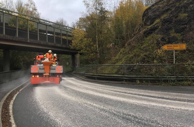 Am Mittwochmorgen musste die Feuerwehr Menden im Hönnetal und auf der eingerichteten Umleitungstrecke eine Kraftstoffspur beseitigen. Diese zog sich über die Hönnetalstraße bis in den Ortsteil Asbeck und weiter Richtung Balve. Dort befand sich ebenfalls die örtliche Feuerwehr im Einsatz. Über eine Streuanlage an einem LKW der Feuerwehr und teilweise von Hand, streuten die Mendener Einsatzkräfte die mehrere Kilometer lange Kraftstoffspur ab. Um den Verkehr vor der Gefahrenstelle zu warnen wurden entsprechende Schilder aufgestellt. Etwa 20 Einsatzkräfte der Feuerwache Menden und der Löschgruppen Lendringsen der Freiwilligen Feuerwehr befanden sich für eine Stunde im Einsatz.