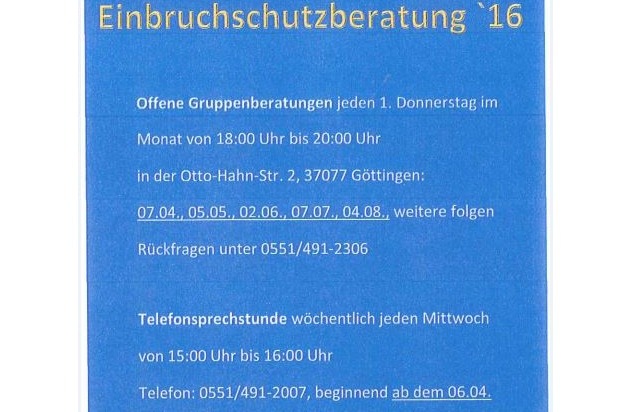 Einen weiteren Service bietet die Polizeiinspektion Göttingen mit der speziellen "Einbruchschutz"-Telefonberatung an. Jeden Mittwoch in der Zeit von 15.00 bis 16.00 Uhr steht ein Experte der Polizei unter Telefon 0551/491-2007 für alle Fragen zum Thema zur Verfügung.
