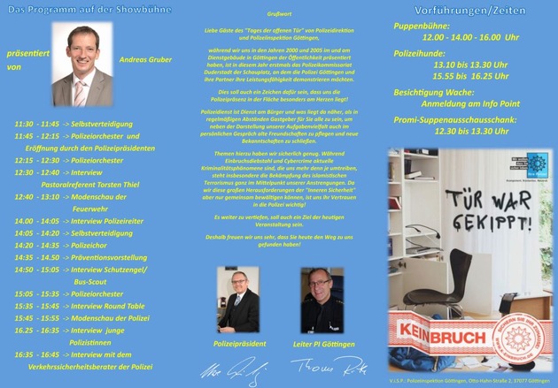 Zu einem weiteren Besuchermagneten dürfte sich am Sonntag vermutlich auch die Showbühne entwickeln. Hier finden den ganzen Tag lang verschiedene Vorführungen (wie z. B. Selbstverteidigung, Modenschau Feuerwehr/Polizei) und diverse Experten-Interviews statt (siehe hierzu das Faltblatt mit Programm im Anhang). Musikalisch werden das Polizeiorchester Niedersachsen und der Polizeichor Göttingen vertreten sein.