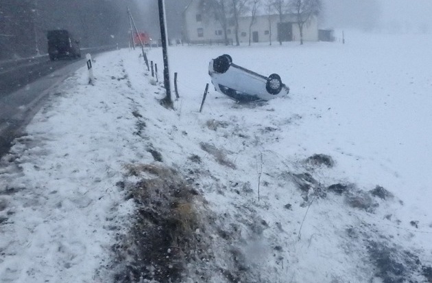 Am 17.01.2018, gegen 13.50 Uhr, kam eine 20-jährige Fahrerin aus Halver mit einem Pkw Fiat 500 bei einem Überholmanöver auf der Brantener Straße in Richtung Halver nach rechts von der Fahrbahn ab. Das Fahrzeug durchbrach einen Zaun und kam, nachdem es sich überschlug, etwa 15 m weiter auf dem Dach liegend zum Stillstand. Zeugen eilten der leicht verletzten Fahrerin zur Hilfe und verständigten die Polizei. Mit einem Rettungswagen wurde die 20-jährige in ein nahe gelegenes Krankenhaus gebracht.